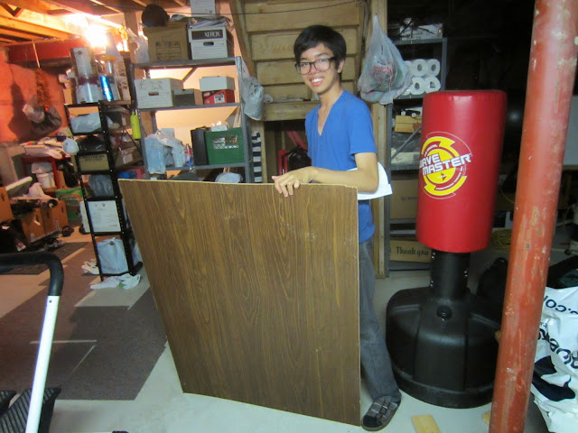 My basement is a wonderland of random materials including scraps of wood, fabric, canvas, and most things you would ever need for any DIY project. Flooring for the cage had to be waterproof, chew-proof, and something easily cleaned. We found this piece of finished wood in the basement that was massive. I believe it used to be a table top? For the largest table in existence maybe. I wish I took a before photo because that was a mission and a half to cut. I never got to saw anything, so that in itself was heaps of fun. We sanded the side and carried it to the backyard to rinse off.